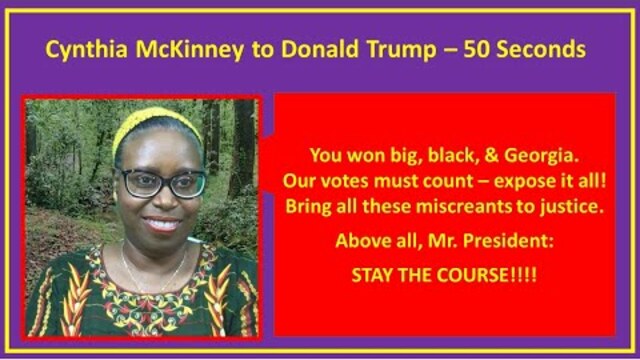 Dr. (PhD) Cynthia McKinney in 50 Seconds — Trump Won Big; Expose It All, STAY THE COURSE
